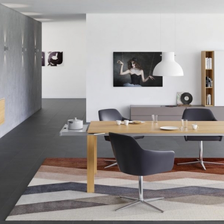 Indication de prix pour une version avec accoudoirs en cuir (ROMA) ou similicuir (Decovin Nappa) en rembourrage serré avec un pied en chêne massif nature
